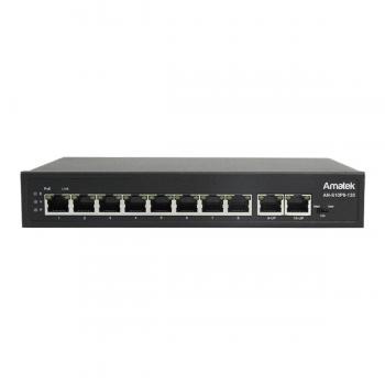 Коммутатор на 10 портов (1 HiPoE + 7 PoE+ портов + 2 порта Uplink 100Mбит/с): 1 порт 10/100Mbps RJ45, Auto-MDIX, PoE/PoE+/HiPoE до 15.4/30/60 Вт каждый;7 портов 10/100Mbps RJ45, Auto-MDIX, PoE/PoE+ до 15.4/30 Вт каждый;+ 2 порта 10/100Mbps RJ45 (Uplink).Поддержка IEEE 802.3af/at/bt Power over Ethernet. Суммарная мощность PoE до 120Вт. Индикация: Link/Activity, Скорость, PoE, 220В. Таблица MAC адресов 1К, матрица 2 Гбит/с.Режим CCTV позволяет передавать данные на расстояние до 250 метров на скорости до 10 Мбит/с. Поддержка деления на 8 VLAN. Защита портов от перенапряжения, короткого замыкания и переполюсовки. Температура -10…+ 55°С. Потребляемая мощность 3Вт (без учёта PoE). Встроенный блок питания AC ~220В. Размеры 210x150x35 мм.