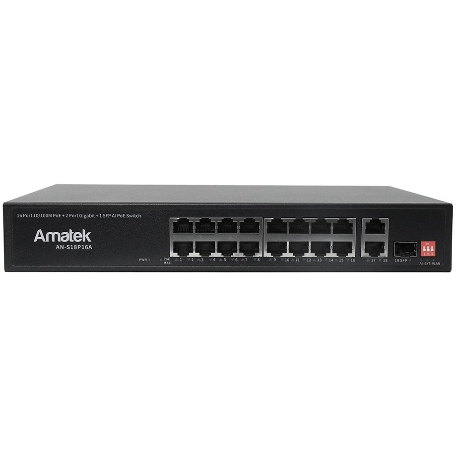 Коммутатор на 19 портов (16 PoE портов + 2 порта Uplink + 1 слот SFP):16 портов 10/100M RJ-45 PoE/PoE+ (до 15.4/30 Вт каждый) + 2 порта 10/100/1000M RJ-45 (Uplink) + 1 порт 10/100/1000M SFP (Uplink). Поддержка PoE (IEEE 802.3af/at). Увеличенная дальность передачи питания по PoE до 250м Суммарная мощность PoE портов до 250Вт. Таблица MAC адресов 4096 (4K), скорость коммутационной матрицы 9,2 Гбит/с. Режим CCTV - дальность передачи данных до 250 метров на скорости до 10 Мбит/с. Auto-MDIX. Поддержка аппаратного VLAN. Функция PoE Watchdog - контроль и перезапуск устройств с PoE по питанию. Защита портов от перенапряжения, короткого замыкания и переполюсовки. Рабочая температура -20…+50°С, питание AC 100-240 В, размеры 280(ш) x 190(г) x 44.5(в) мм. Высота 1U.