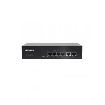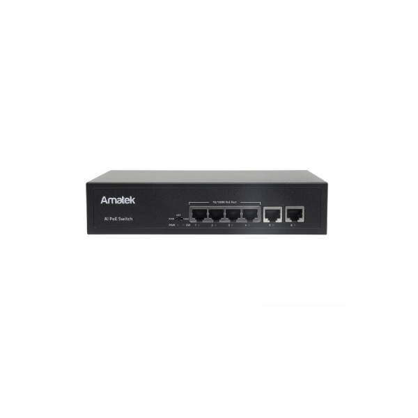 Коммутатор на 6 портов (4 PoE+ порта, 2 порта FE Uplink): 4 порта 10/100Mbps с PoE/PoE+ до 15.4/30 Вт каждый, RJ45, Auto-MDIX;