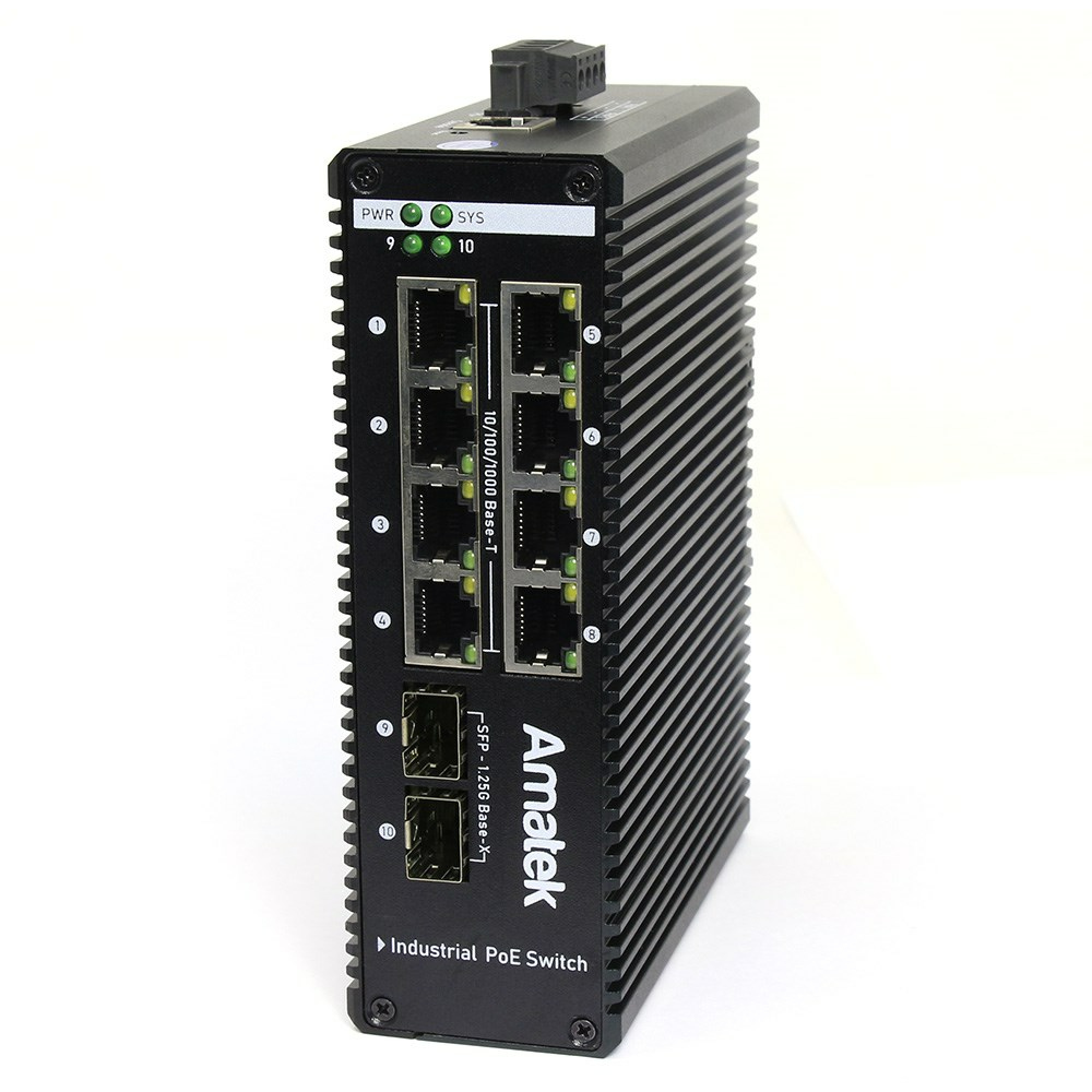 Промышленный управляемый коммутатор на 10 портов (8 PoE+ портов + 2 слота SFP). Общее количество портов: 10. Порты: 8 портов (1000Мбит/с, RJ45, PoE+), 2 слота SPF (1000Мбит/с). Стандарт PoE (Power over Ethernet): IEEE 802.3af (15,4Вт на канал), IEEE 802.3at (до 30Вт на канал), возможно управление. Бюджет PoE: 240 Вт.