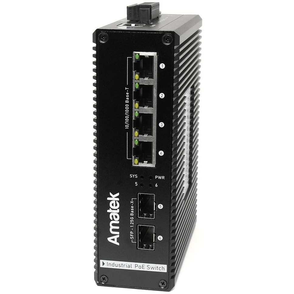 Промышленный управляемый коммутатор на 6 портов (4 PoE+ портов + 2 слота SFP): 4 порта 100/1000M RJ-45 PoE/PoE+ (до 15.4/30 Вт каждый) + 2 порта 10/100/1000M SFP (Uplink). Поддержка PoE (IEEE 802.3af/at). Суммарная мощность PoE портов до 120Вт. Функция PoE Watchdog - контроль и перезапуск устройств с PoE по питанию. Интерфейс управления WEB, SNMP, Telnet, консольный порт RJ45. Управление: VLAN (802.1q, QinQ), поддержка Spanning Tree (STP/RSTP/MSTP), ERPS, QoS, зеркалирование портов, управление PoE. Безопасность: SSH, SSL, 802.1x, аутентификация доступа RADIUS/TACACS+, MAC Address Binding, ACL, фильтр TCP/UDP, IGMP Snooping (v2/v3, 256 групп), MLD (v1/v2) snooping, защита от широковещательных штормов, агрегация до 8 портов. Индикация: Link/Activity, Скорость, 220В. Таблица MAC адресов 8192 (8K), скорость коммутационной матрицы 32 Гбит/с. Выход "FALL" – размыкание цепи при отключении питания. MTBF 100 000 часов. Защита портов от перенапряжения до 6000В (ESD). Рабочая температура -40…+85°С, влажность: 5%~95%, без конденсата. 2 входа питания DC 44-56В (c PoE) / DC 12В (без PoE) Защита от переполюсовки питания. Корпус металлический с креплением на DIN-рейку 35мм, размеры 150x130x50мм, класс защиты IP40. Вес 0,8кг.
