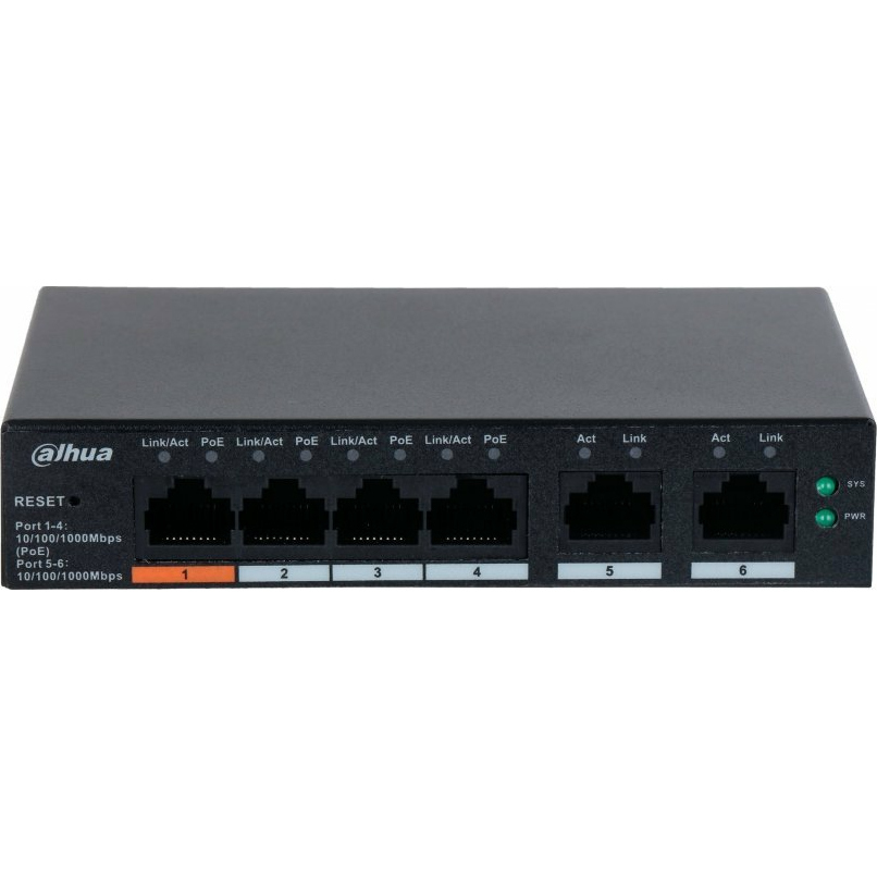 4-портовый гигабитный PoE коммутатор с функцией облачного управления Порты: 4 RJ45 10/100/1000Мбит/с (PoE/PoE+/Hi-PoE), 2 RJ45 10/100/1000Мбит/с (uplink); мощность PoE: порт 1 до 60Вт, порты 2~4 до 30Вт, суммарно до 60Вт; PoE watchdog, передача до 250м; питание: 53В(DC)