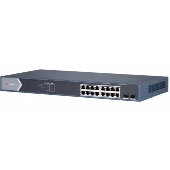L2, Смарт-управляемый, 16 1000M RJ45 PoE-порт, 2 Gigabit combo порт, 802.3af/at, бюджет PoE 225W, поддержка режима передачи до 300м, визуализированная топология управления(Hik-Central/iVMS 4204/Hik-ProConnec), контроль статуса сети, уведомление тревог в реальном времени, контроль и обзор видеонаблюдения, PoE watchdog, VLAN, QoS, SNMP, STP/RSTP, Port Mirroring, Storm Control.