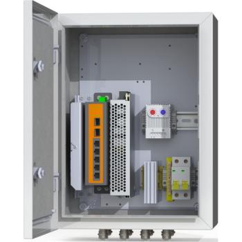 Предназначен для использования в любых климатических условиях на улице (-60°С +50°С) Степень пылевлагозащиты IP66. Корпус стальной 1,5 мм. Настенное крепление. Входное напряжение 220В Комплектация: Двухполюсный защитный автомат 6А - 1 шт.Обогреватель 50Вт - 1 шт. Сдвоенный термостат - 1 шт. Блок питания 150Вт -1 шт. Промышленный управляемый коммутатор 4*PoE 802.3 af/at, 2*SFP - 1 шт. Оптический кросс 4 порта SC - 1 шт. Гермовводы 4*PG9, 4*PG13,5 -1 комплект. Цвет ral 7035 (серый)