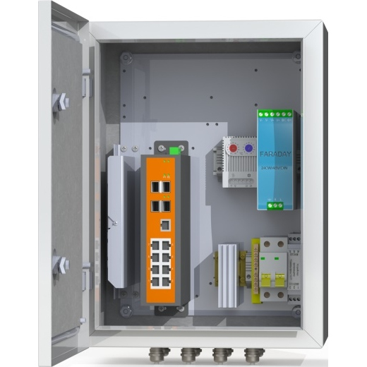 Предназначен для использования в любых климатических условиях на улице (-60°С +50°С) Степень пылевлагозащиты IP66. Корпус стальной 1,5 мм. Настенное крепление. Входное напряжение 220В Комплектация: Двухполюсный защитный автомат 6А - 1 шт.Обогреватель 50Вт - 1 шт. Сдвоенный термостат - 1 шт. Блок питания 240Вт -1 шт. Промышленный управляемый коммутатор 8*PoE 802.3 af/at, 2*SFP - 1 шт. Оптический кросс 4 порта SC - 1 шт. Гермовводы 4*PG9, 4*PG13,5 -1 комплект. Цвет ral 7035 (серый)