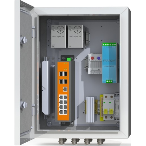 Предназначен для использования в любых климатических условиях на улице (-60°С +50°С) Степень пылевлагозащиты IP66. Корпус стальной 1,5 мм. Настенное крепление. Входное напряжение 220В Комплектация: Двухполюсный защитный автомат 6А - 1 шт.Обогреватель 50Вт - 1 шт. Сдвоенный термостат - 1 шт. Блок питания 240Вт -1 шт. Промышленный управляемый коммутатор 8*PoE 802.3 af/at, 2*SFP - 1 шт. Оптический кросс 4 порта SC - 1 шт. Устройство грозозащиты линии 220В -1 шт. Устройство грозозащиты линий PoE -2 шт. Гермовводы 4*PG9, 4*PG13,5 -1 комплект. Цвет ral 7035 (серый)