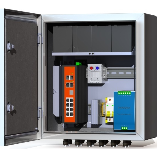 Предназначен для использования в любых климатических условиях на улице (-60°С +50°С) Степень пылевлагозащиты IP66. Корпус стальной 1,5 мм. Настенное крепление. Входное напряжение 220В Комплектация: Двухполюсный защитный автомат 6А - 1 шт.Обогреватель 50Вт - 1 шт. Сдвоенный термостат - 1 шт. Блок бесперебойного питания 300Вт -1 шт. Аккумулятор 12В, 7А/ч - 4 шт. Промышленный неуправляемый коммутатор 8*PoE 802.3 af/at, 2*SFP - 1 шт. Оптический кросс 4 порта SC - 1 шт. Гермовводы 4*PG9, 4*PG13,5 -1 комплект. Цвет ral 7035 (серый)