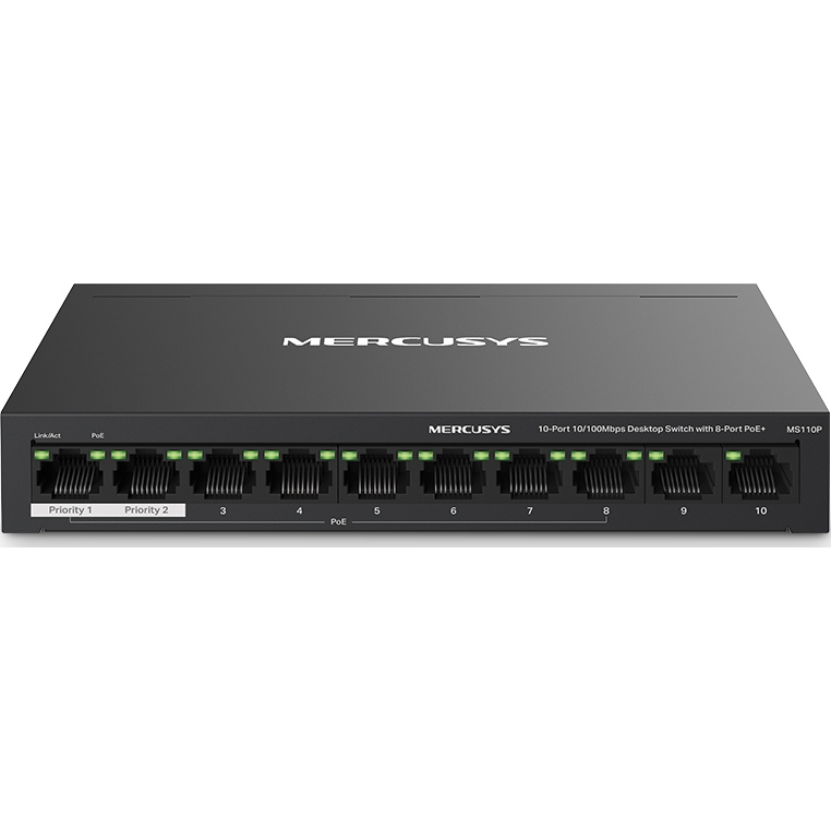 Настольный коммутатор с 10 портами 10/100 Мбит/с (8 портов PoE+). Десять портов: 10 портов RJ45 10/100 Мбит/с. Восемь портов PoE+: позволят подавать питание и передавать данные по одному кабелю. Бюджет PoE: бюджет на один порт составляет 30 Вт, а общий бюджет — 65 Вт. Два порта Uplink: один — для подключения к интернету, а другой — для подключения к сетевому видеорегистратору. Режим увеличения дальности: позволит увеличить дальность передачи до 250 метров. Режим изоляции: позволяет одним нажатием разделить клиентский трафик для повышения безопасности и производительности. Совместимость: работает с питаемыми устройствами, поддерживающими стандарты IEEE 802.3af/at. Прочный корпус из металла: обеспечивает эффективное рассеивание тепла и долгий срок службы. Plug and Play: не требуется предварительная настройка. Автовосстановление PoE: автоматическая перезагрузка питаемых по PoE устройств, которые перестали отвечать.