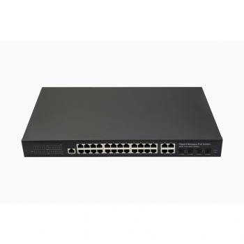 Управляемый L2 PoE коммутатор Gigabit Ethernet на 24 RJ45 PoE + 4 x GE Combo Uplink порта. Порты: 24 x GE (10/100/1000 Base-T) с поддержкой PoE (IEEE 802.3af/at), 4 x GE Combo Uplink (RJ45 + SFP). Соответствует стандартам PoE IEEE 802.3af/at. Автоматическое определение и режим антизависания PoE устройств. Мощность PoE на порт - до 30W. Суммарная мощность PoE до 400W. Поддержка режима CCTV: Увеличение расстояния передачи данных и питания до 250м. Встроенная грозозащита 3kV на порт. Питание: AC100-240V (415W). Встроенный БП. Монтаж в 19 - дюймовую стойку, крепление в комплекте. Размеры (ШхВхГ): 440 x 45 x 290мм. Рабочая температура: 0…+50°С.