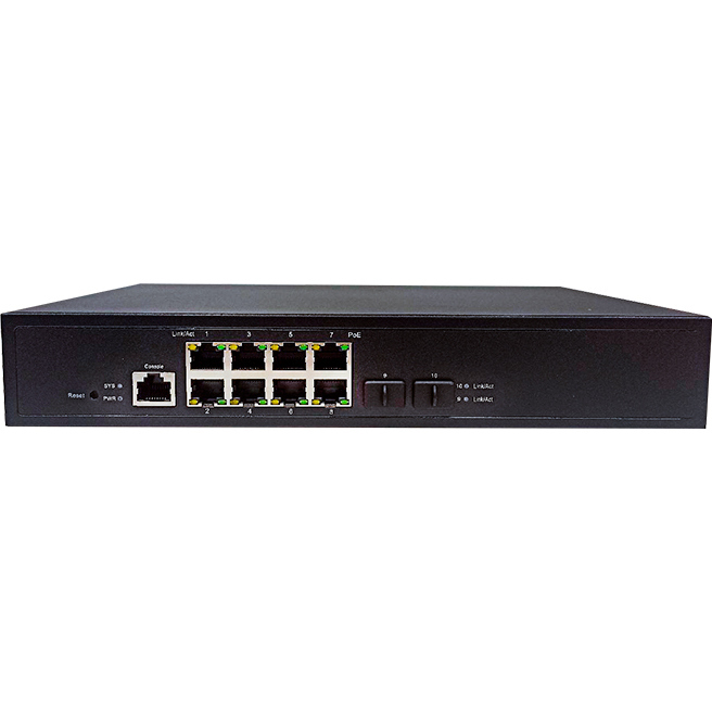 8 портов до 1000Mbps RJ-45, PoE+ 2 порта 100/1000 Mbps SFP 1 консольный порт RJ-45, PoE Стандарт IEEE 802.3af/at, Active POE type A, контакты 1/2(+),3/6(-), PoE Бюджет 120 Вт, Коммутационная способность 20 Гбит/с, Питание коммутатора АС 100~240 В, 50/60Гц Рабочая температура: от 0°C до 45°C, 270х180х45 мм, 1200 гр.