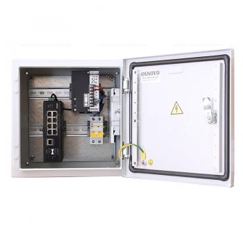 Уличный коммутатор на базе уличной станции OSNOVO OS-331. Порты: 6 x FE (10/100Base-T) с PoE (до 30W) + 2 x FE (10/100Base-T) с PoE (до 60W) + 1 x GE (10/100/1000Base-T) + 2 x GE SFP (1000Base-X). Режим антизависания и режим удлинения линий связи по 8-ми PoE портам до 250м (скорость до 10Мбит/с). Металлический шкаф (ШxВxГ): 300х300х210мм, питание AC100-240V, суммарный бюджет PoE до 240W, оптический кросс, температурный диапазон -40…+50°С, исполнение IP66.