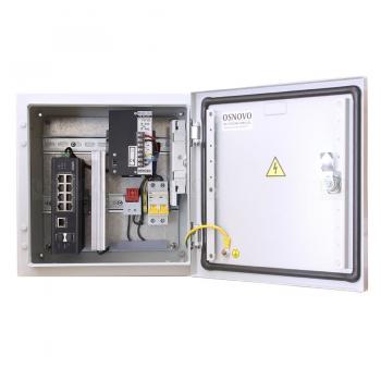 Уличный коммутатор с термостабилизацией на базе уличной станции OSNOVO OS-33T1. Порты: 6 x FE (10/100Base-T) с PoE (до 30W) + 2 x FE (10/100Base-T) с PoE (до 60W) + 1 x GE (10/100/1000Base-T) + 2 x GE SFP (1000Base-X). Режим антизависания и режим удлинения линий связи по 8-ми PoE портам до 250м (скорость до 10Мбит/с). Металлический шкаф (ШxВxГ): 300х300х210мм, питание AC100-240V, оптический кросс. Рабочая температура (температура окружающей среды): -50…+50°С, температура внутри станции -15…+55°С, исполнение IP66.