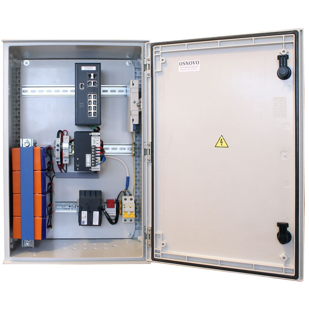 Уличный управляемый (L2+) коммутатор на 12 портов с термостабилизацией и резервным питанием на базе уличной станции OSNOVO OS-46TB1. Порты: 2xGE (10/100/1000Base-T) с PoE BT (до 90W) + 6xGE (10/100/1000Base-T) с PoE (до 30W) + 2xGE RJ45 (10/100/1000Base-T)+ 2 GE SFP (1000Base-X). Соответствует стандартам PoE IEEE 802.3af/at/bt. Автоматическое определение и режим антизависания PoE устройств, управление питанием. Металлический шкаф (ШxВxГ): 400х600х210мм, питание AC195-265V (промышленный БП с выходным напряжением DC48V - модель: PS-55240/I, АКБ 48В(7Ач)), cуммарная мощность PoE до 240W, оптический кросс, исполнение IP66. Рабочая температура (температура окружающей среды): -60…+50°С, температура внутри станции -10…+55°С. Имеется Сертификат Транспортной Безопасности.
