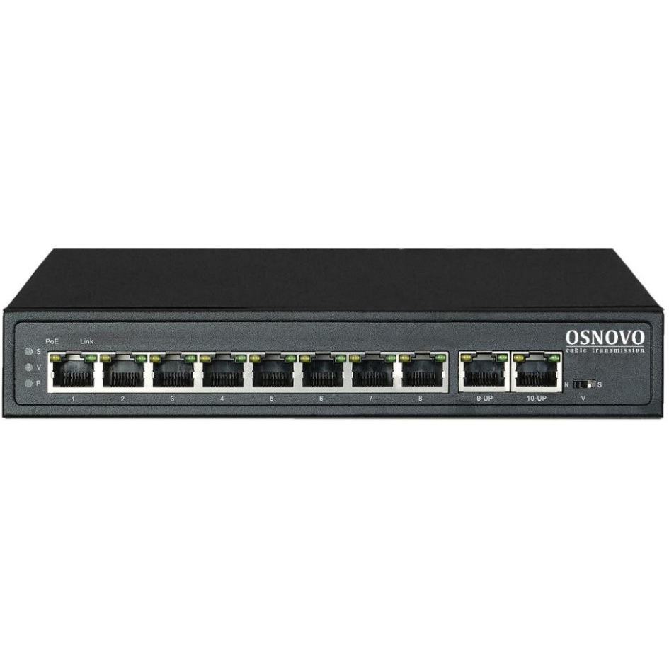 PoE коммутатор Fast Ethernet на 10 RJ45 портов. Порты: 8 x FE (10/100 Base-T) с поддержкой PoE (IEEE 802.3af/at), 2 x FE (10/100 Base-T). Соответствует стандартам PoE IEEE 802.3af/at. Автоматическое определение и режим антизависания PoE устройств. Мощность PoE на порт - до 30W. Суммарная мощность PoE - до 120W. Поддержка режима CCTV: Увеличение расстояния передачи данных и питания до 250м, изоляция портов (VLAN). Встроенная грозозащита 6кВ. Питание: AC100-240V (123W). Размеры (ШxВxГ): 210x35x150мм. Рабочая температура: -10...+55 гр. С.