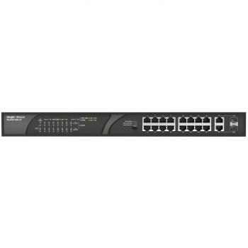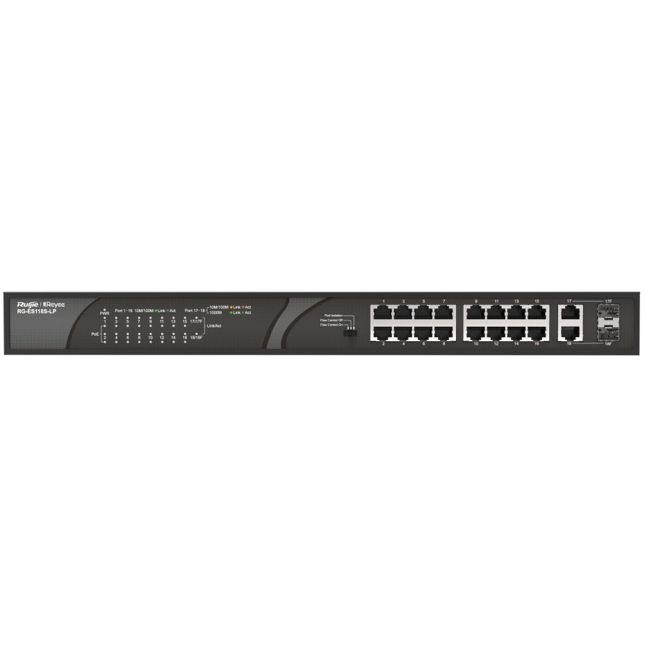 16-портовый 100 Мбит/с + 2 гигабитных комбинированных порта RJ45/SFP, 16 портов поддерживают блок питания PoE/PoE+. Максимальный бюджет мощности PoE составляет 120 Вт, неуправляемый коммутатор