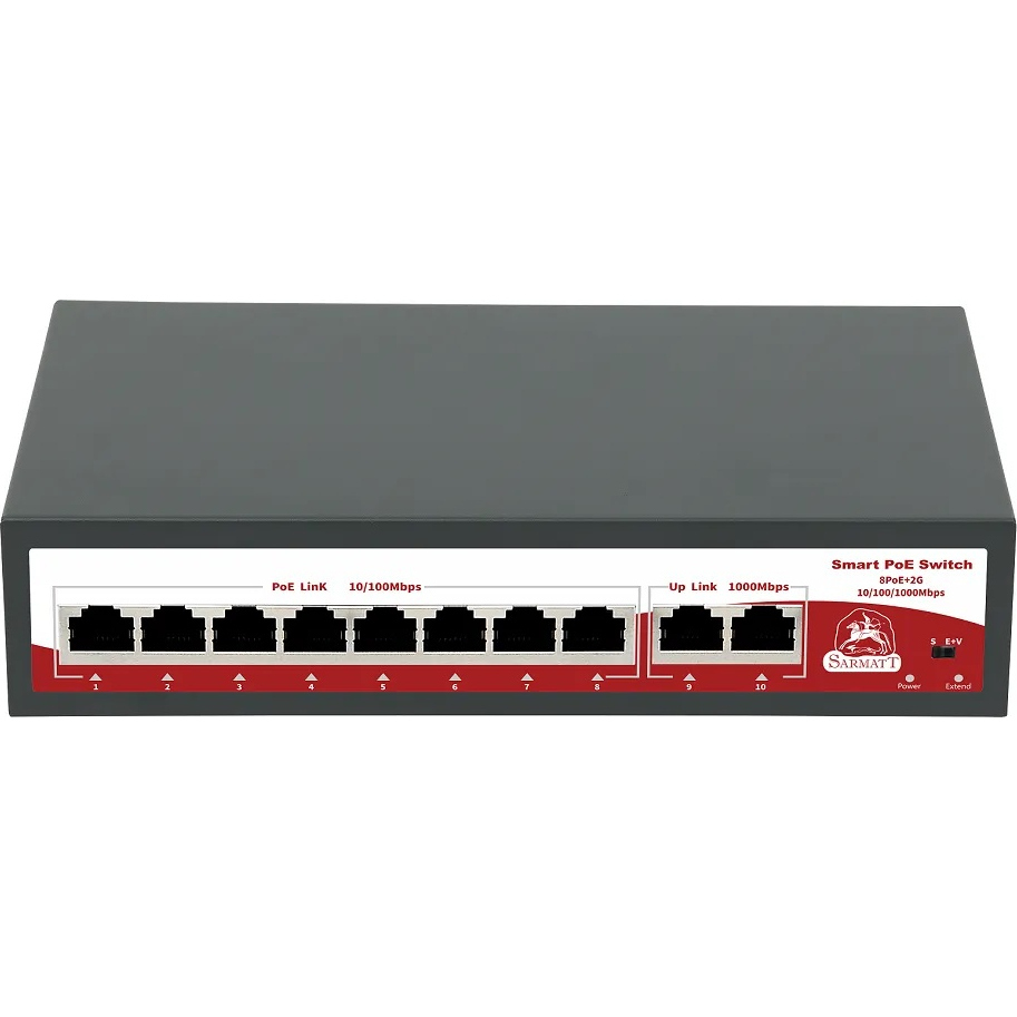 Коммутатор сетевой с РоЕ Gigabit Ethernet 10 портовый; 8 портов POE 10/100Mbps RJ-45 с поддержкой Auto-MDIX, IEEE 802.3af/IEEE 802.3at(до 30Вт), 2 порта 10/1000/Mbps RJ-45 Uplink; Суммарно до 120 Вт; АC 220В, 1,25A, 200х118х44 мм. Дальность передачи до 250 метров.