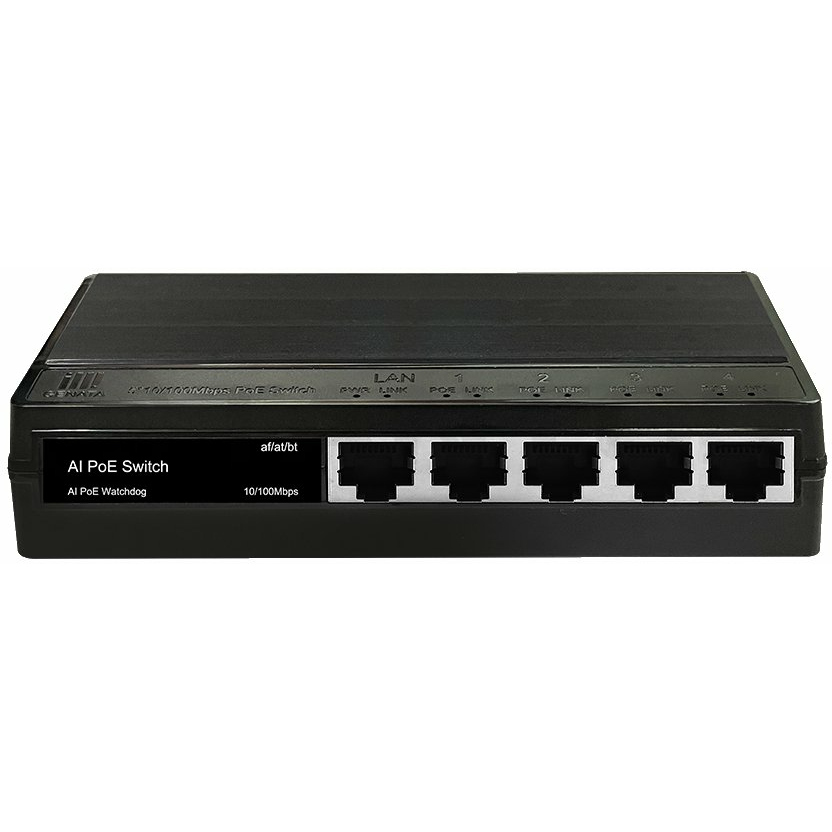 5 портовый неуправляемый PoE коммутатор, 4x100 Мбит/с PoE портов (3 порта 802.3af/at, максимальная мощность PoE 30 Вт на порт, 1 порт 802.3af/at/bt, максимальная мощность PoE 60 Вт на порт) + 100 Мбит/с порт Uplink. Общий бюджет PoE 60 Вт. Автоматический PoE watchdog, встроенный блок питания, грозозащита и защита от статического электричества, -30...+60°С.