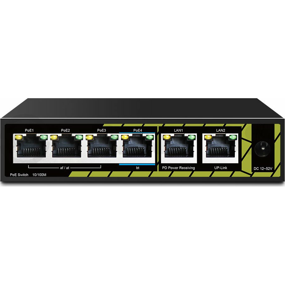 Коммутатор с питанием по PoE In, 4 x 100 Мбит/с PoE порта (3 порта 802.3af/at, 1 порт 802.3af/at/bt) + 2 x 100 Мбит/с порта Uplink.