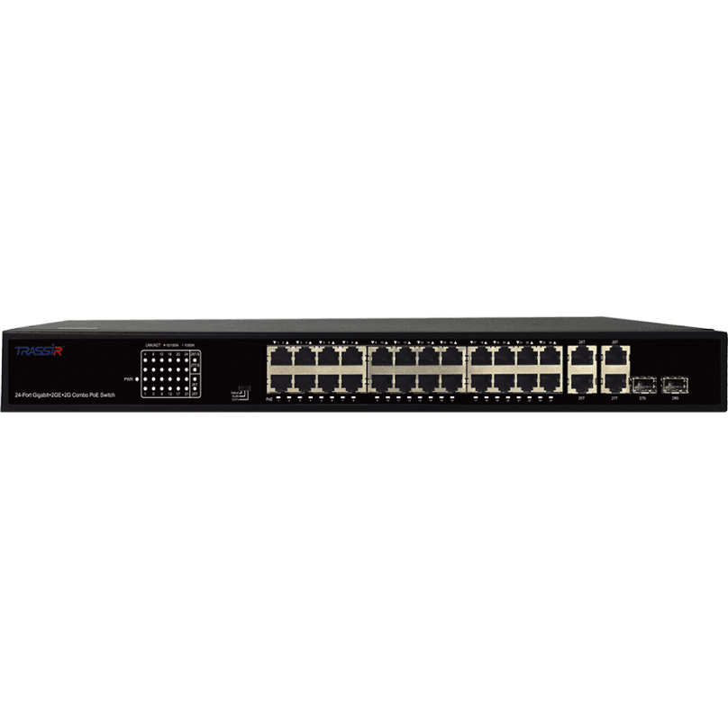 Неуправляемый коммутатор TRASSIR с24 PoE портами (10/100/1000 Мбит/с Base-T PoE port),и 2 Combo портами (10/100/1000 Мбит/с Base-T), 2 Uplink (10/100/1000 Мбит/с Base-T), стандарты PoE EEE802.3af, EEE802.3at, максимальная мощность на порт 32Вт, общая - 370 Вт. Дальность передачи PoE до 250 метров. Максимальная потребляемая мощность 390 Вт. Молниезащита. Рабочая температура: 0...40?С. Габариты: 440х44х207.