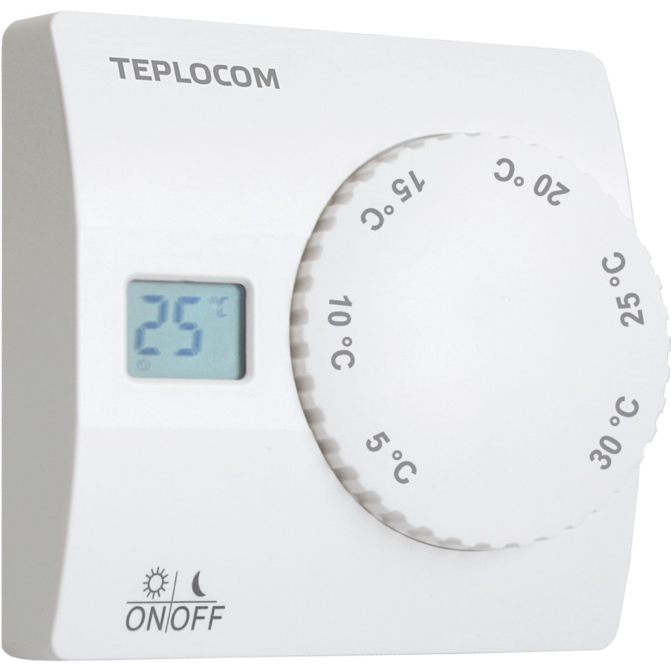 Проводной электронный комнатный термостат. Питание от двух батарей типа АА, 2 шт. Контакты реле до 250В, 8А. Температура регулировки от 5°С до 30°С. Гистерезис ±1°С. LCD дисплей. Индикация температуры в помещении. Индикация состояния котла. Индикация разряда батарей. Кнопка включения и выключения термостата. Кнопка переключения дневного и ночного режима. Ночной режим NSB. Защита системы от замерзания. Работа с нормально открытой или нормально закрытой логикой. Может использоваться в системах отопления или кондиционирования. Установка задержки старта компрессора для систем кондиционирования