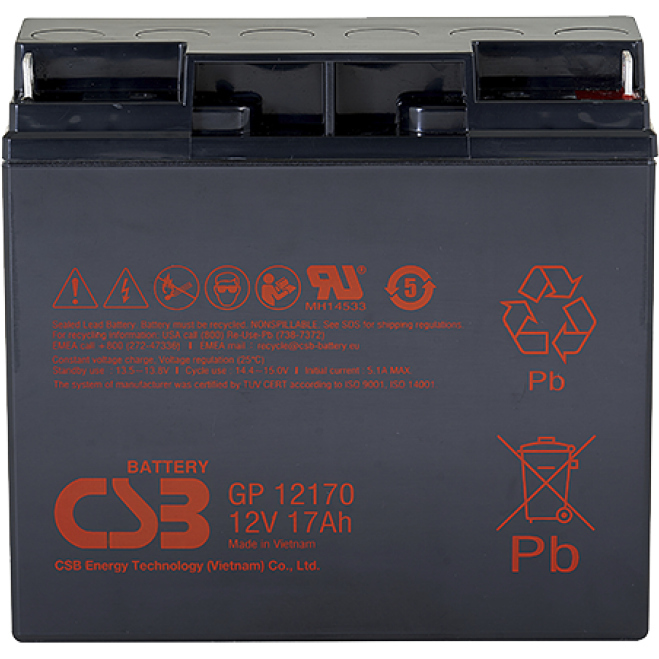 Аккумулятор 12В, 17Ач общего применения со сроком службы 5 лет в буферном режиме или более 260 циклов заряда-разряда в циклическом режиме при 100% разряде. Как и все батареи CSB, она перезаряжаемая, высокоэффективная и не требующая обслуживания. Благодаря специальной формуле производства свинцово-кальциевого сплава и технологиям изготовления - уменьшается процесс газообразования. Номинальное напряжение: 12 В (6 элементов на блок). Вес: 5.5 кг. Максимальный ток разряда: 230 A (5 сек). Внутреннее сопротивление: 14 мОм. Диапазон рабочих температур: разряд: от -15 °С до +50 °С заряд: от -15 °С до +40 °С хранение: от -15 °С до +40 °С. Ток короткого замыкания: 532 А. Номинальная рабочая температура: 25 °С. Напряжение подзаряда: 13.5 - 13.8 В при 25 °С. Максимальный ток заряда: 5.1 A. Напряжение заряда в режиме выравнивания: 14.4 - 15.0 В при 25 °С. Саморазряд: Менее 10% за 90 дней. Можно хранить без подзаряда более 6 месяцев при +25 °C. Выводы: под болт М5 с гайкой. Материал корпуса: ударопрочный, износостойкий ABS (UL94-HB). Длина: 181.0 ± 2.0. Ширина: 76.2 ± 1.0. Высота: 167.0 ± 2.0. Высота (с клеммами): 167.0 ± 2.0