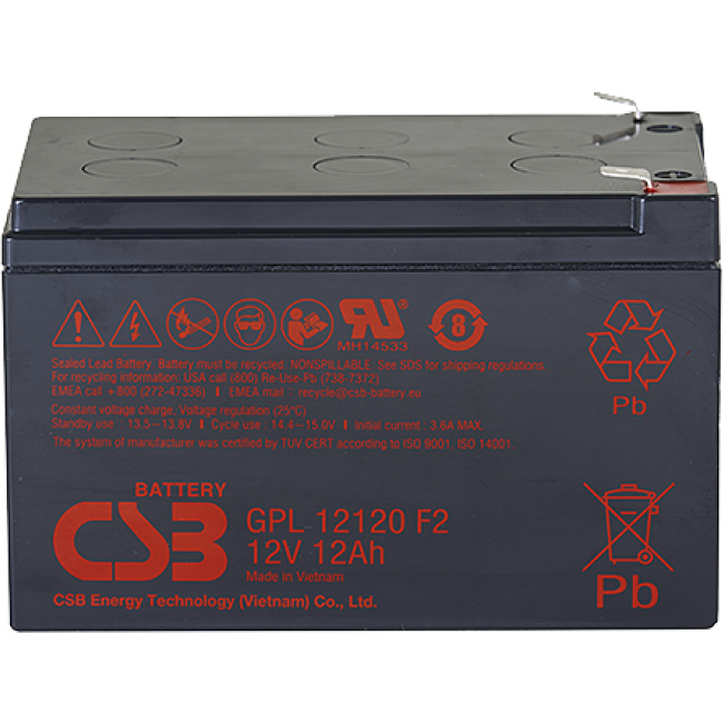 Батарея общего применения 12В, 12Ач, со сроком службы 8 лет (10-12 лет при 20 °С по классификации Eurobat) в буферном режиме или более 260 циклов заряда-разряда в циклическом режиме при 100% разряде. Как и все наши аккумуляторные батареи CSB, она перезаряжаемая, высокоэффективная и не требует обслуживания. Выводы: F2 (Faston Tab 250).