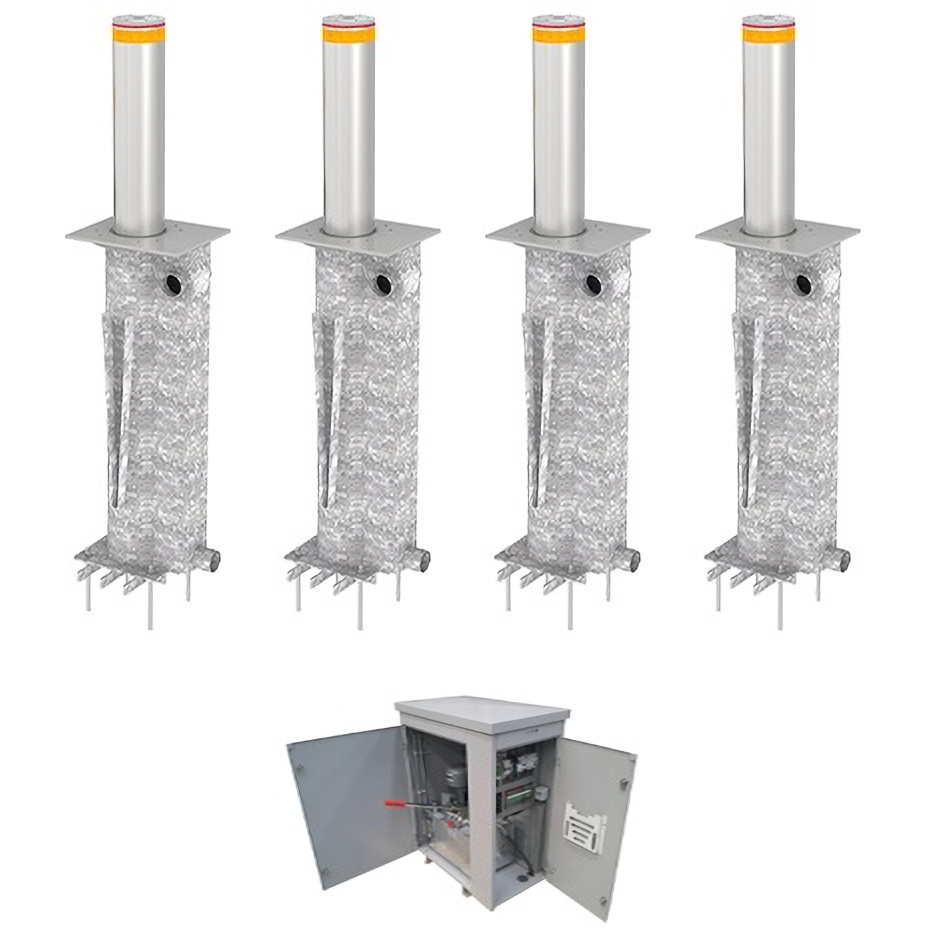 Блокиратор автоматический выдвижной серии TBD Traffic Regulation. В комплекте 4 болларда, шкаф управления с рукавом высокого давления 10 метров, межблочными рукавами 1,2 метра и клапаном аварийного опускания преграды. Столбы оборудованы зуммером, светодиодной индикацией и рубашкой из нержавеющей стали.