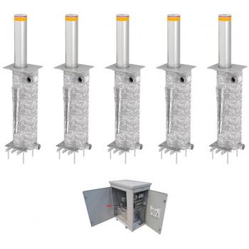 Блокиратор автоматический выдвижной серии TBD Traffic Regulation. В комплекте 5 боллардов, шкаф управления с рукавом высокого давления 10 метров, межблочными рукавами 1,2 метра и клапаном аварийного опускания преграды. Столбы оборудованы зуммером, светодиодной индикацией и рубашкой из нержавеющей стали.