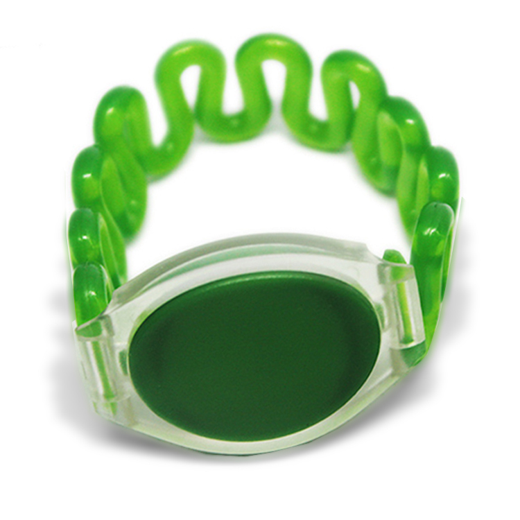 Браслет формата Temic. Рабочая частота 125кГц, чип T5577, диаметр - 65 мм, материал - АБС-пластик и ПВХ, цвета: зеленый. Предназначен для записи или копирования уникального номера (может имитировать идентификаторы форматов EM-Marin и HID Prox).
