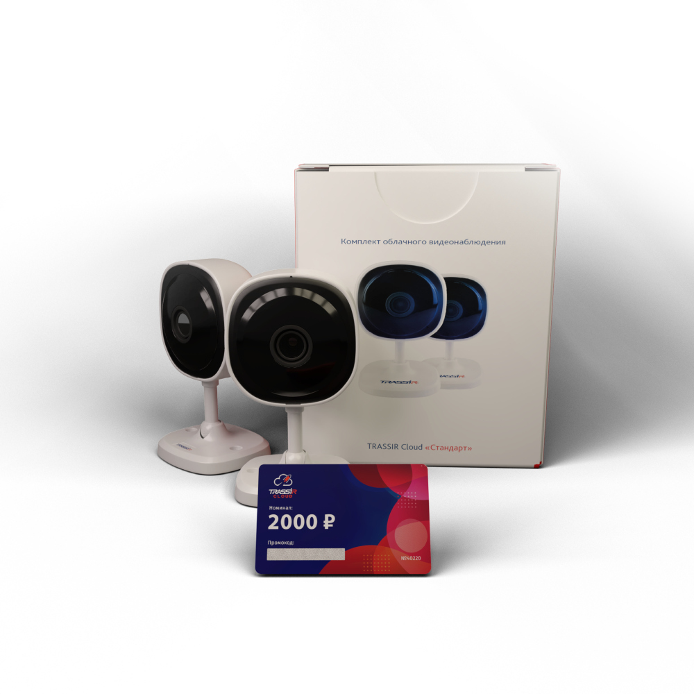 Комплект облачного видеонаблюдения TRASSIR CloudStandart. Основные преимущества: комплект дешевле, чем покупка каждого компонента по отдельности. С помощью карты пополнения счета TRASSIR Cloud номиналом 2000 руб пользователь может подключить запись и хранения архива в облаке в среднем на 6 мес. TR-W2C1 - 2 шт. 2 Мп Wi-Fi камера TRASSIR, матрица 1/2.9" CMOS, разрешение FullHD(1920x1080)@25к/с, чувствительность 0.005Лк (F1.8) / 0Лк (с ИК), real WDR (105dB), ИК-подсветка до 10м, режим "день/ночь" (механический ИК-фильтр), поддержка Н.265, слот для MicroSD до 128Гб, встроенные микрофон/динамик, питание: 5В DC (micro-USB штекер), -10°C ... +50°C. Предназначены для работы в TRASSIR CLOUD. Не совместимы с ПО TRASSIR.