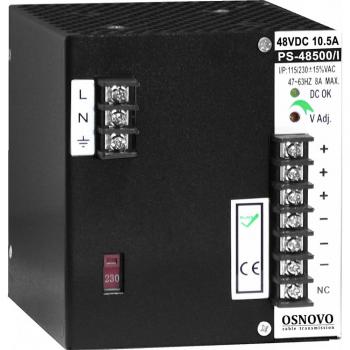 Промышленный блок питания. DC48V, 10,5A (500W). Диапазон входных напряжений: AC195-265V. КПД: 85%. Регулировка выходного напряжения в диапазоне 44-53V. Защита от короткого замыкания, перенапряжения и перегрузки. Принудительная система охлаждения (вентилятор). Монтаж на DIN-рейку или стену. Размеры (ШxВxГ): 100x110x121мм. Рабочая температура: -40...+50°C.