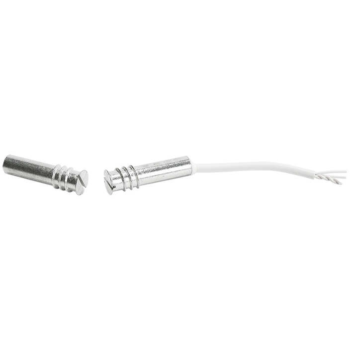 Магнитоконтактный извещатель врезной в алюминиевом корпусе, тамперный шлейф, монтаж ввертыванием, кабель 110 см., подключение проводов непосредственно внутри корпуса. Тип извещателей NC, максимальное переключаемое напряжение геркона 20 В, максимальный ток 20 mA, размеры (мм): Ø 8,5, длина 33,1. Диапазон рабочих температур - 30°C...+ 65°C.