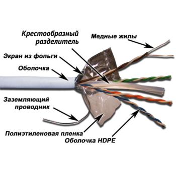 Кабель TWT FTP, 4 пары, Кат.6, LSZH, белый, 305 метров. Экранированный 4-х парный кабель категории 6 для передачи цифровой и аналоговой информации на частотах до 500 МГц. Кабель состоит из 4-х витых пар одножильных медных проводников, разделенных крестообразной перегородкой и заключенных в общий экран из фольги и внешнюю оболочку. Кабель поставляется на катушках по 305 метров. Диаметр проводника – 23 AWG.