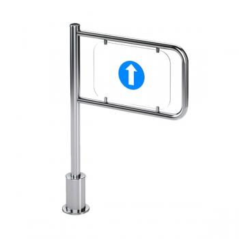 Калитка механическая левая односторонняя с пружинным возвратом устанавливается в качестве заграждения, предназначена для прохода в заданном направлении. Все элементы конструкции калитки выполнены из шлифованной нержавеющей стали. Створка калитки крепится к стойке при помощи установочных винтов. Стойка вращается относительно неподвижного основания, прикрепленного к полу. Крепление к полу скрывает крышка основания. В калитке предусмотрена возможность установки створок различной длины для формирования прохода шириной 600 мм. Калитка закрывается после прохода при помощи пружины, направление движения обозначается стрелкой.