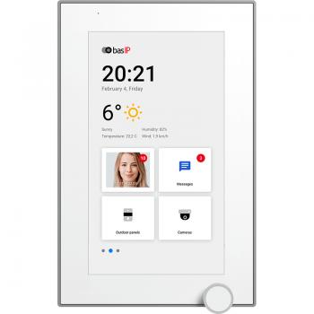 7-дюймовый IP-видеомонитор для помещений с возможностью горизонтального и вертикального монтажа, возможностью управления лифтом, отображением сообщений от управляющей компании, PoE, подключением 32 камер, памятью для фотографий/видео и голосовой почтой. ОПЕРАЦИОННАЯ система – Android. Размеры: 195 x 127 x 27 мм. Корпус: пластик, стекло.
