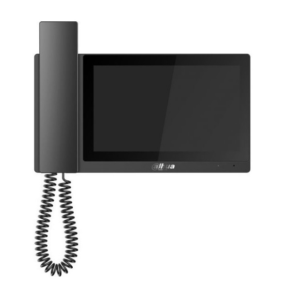 Монитор видеодомофона IP 7-и дюймовый, с трубкой, черный 1024x600 разрешение, ёмкостной сенсорный экран; тревожные входы / выходы 6/1; RS485; LAN; поддержка micro-SD до 32Гб; Возможность просмотра IP видеокамер; Питание: DC 12В/PoE(802.3af); Габаритные размеры: 236 мм × 129,8 мм × 23 мм; Установка - на стену/на стол.