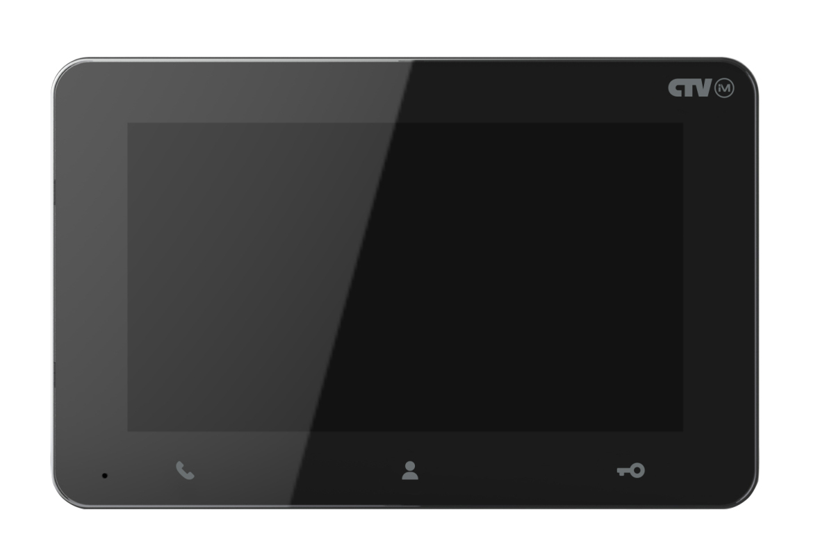 Монитор видеодомофона, стеклянная сенсорная панель управления "Easy Buttons", автоответчик, режим ожидания с индикацией времени, встроенный источник питания Цвет - чёрный. Дисплей: 7 ˝ TFT LCD (16:9). Разрешение (ГхВ): 1024*600. Стандарт видео: PAL/NTSC. Режим интеркома: Полудуплекс. Продолжительность беседы: 120 секунд. Сенсорные кнопки управления: Да. Внутренняя память: Да, на 60 фотографий. Поддержка карт SD: microSD-card class 10 до 32 ГБ, запись фото и видео. Функция детектора движения: Да, 1 канал одновременно. Ток в дежурном режиме: Макс. 250 мА / 12В DC. Ток в рабочем режиме: Макс. 500 мА / 12В DC. Напряжение питания: АС 100-240 В. Рабочая температура: -10...+60°С. Установка: Монтажная пластина. Размеры (ШхВхГ): 194x124x24 мм. Вес (нетто): 0,4 кг