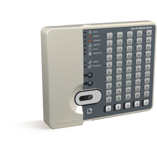 Блок индикации и управления R3-Рубеж-БИУ предназначен для сбора информации с приемно-контрольных приборов R3-Рубеж-2ОП или контроллера адресных устройств R3-Рубеж-КАУ2 и отображения состояния зон, групп зон, исполнительных адресных устройств на встроенном светодиодном табло, а также управления охранными зонами, пожарными зонами и исполнительными адресными устройствами.