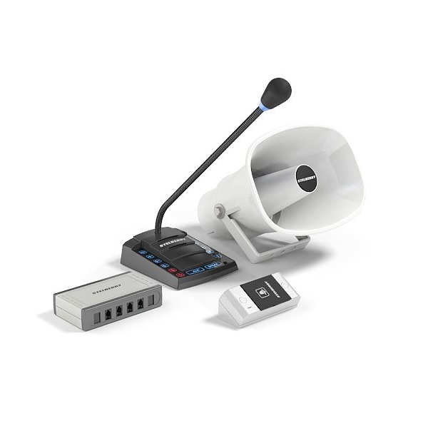 Комплект 1+4-канального переговорного устройства клиент-кассир для АЗС с системой громкого оповещения. Многоканальное переговорное устройство на 4 абонента STELBERRY S-645 имеет один основной канал «клиент-кассир» и четыре коммутируемых дополнительных канала. Канал «клиент-кассир» активен постоянно, сразу после включения переговорного устройства, и отключается только на время связи с одним из четырёх коммутируемых каналов. Абоненты коммутируемых каналов могут вызывать кассира, запрашивая связь с ним, нажатием кнопки вызова на панели абонента. Кассир сам отвечает на вызов с панели абонента, включая вызвавший его канал, либо, при необходимости, сам выбирает любой из коммутируемых каналов для общения. Вариант конференц-связи с двумя - тремя - четырьмя панелями, а также вариант общения между абонентскими панелями, в данном переговорном устройстве не предусмотрен.