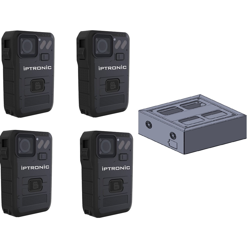 Комплект IPTRONIC IPT-BC1G (4шт) + док-станция IPTRONIC IPT-DS-CT4. Персональное носимое устройство регистрации информации окружающей обстановки. Информационный дисплей. Поддержка записи 2К. Продолжительность записи до 20 часов. GPS/ГЛОНАСС. Ночная съемка. Встроенный аккумулятор 4000мАч. Герконовый слайдер для включения/выключения. Класс защиты IP67. Поддержка выносной камеры. Программное обеспечение в комплекте. Терминал зарядки и передачи данных на ПК. Терминал предназначен для передачи данных на персональный компьютер и одновременной зарядки 4 единиц устройств видеорегистрации информации. С персонального компьютера можно выполнять настройки устройств, управлять архивом, синхронизировать время.