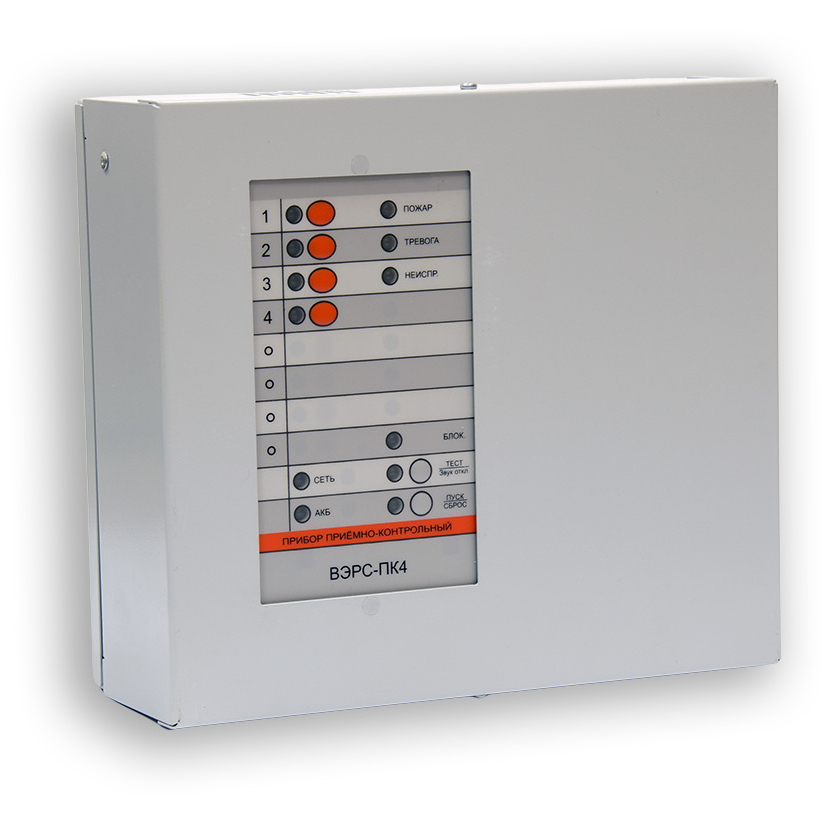 Прибор приемно-контрольный охранно-пожарный, 4 ШС (охранные, пожарные, технологические), 3 реле ПЦН, выходы ОК с током нагрузки до 1А с контролем линий оповещения, вход ТМ, RS-485, конфигурирование с помощью ВЭРС-ПК Prog, напряжение питания 220 В, вход внешнего РИП, под АКБ 12 В /4,5 Ач, металлический корпус.