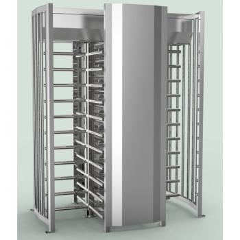 Турникет полноростовой уличного исполнения предназначен для организации проходного режима посетителей на стадионах, аттракционах и в других местах массового скопления людей. Двухпроходное исполнение уменьшает требуемый размер проема для установки турникета. Четырехлопастное исполнение турникета обеспечивает строгое разделение потока посетителей по одному. Коррозионная стойкость обеспечивается использованием элементов из нержавеющей стали. При этом на штангах и неподвижных преграждающих элементах декоративное покрытие отсутствует, а несущие конструкции из эстетических соображений покрыты порошковой краской с дополнительным атмосферостойким лаковым покрытием. Турникет оснащен механическими замками для защиты от несанкционированного прохода при отключении питания. Запатентованная нами система доводки и фиксации делает работу механизма турникета плавной, бесшумной, долговечной и с функцией AntiPassBack. Блок электронного управления турникета состыковывается со СКУД любого типа. Возможно использование турникета в целях импортозамещения, так как по габариту и функционалу он взаимозаменяем с рядом широко применяемых в нашей стране турникетов импортного производства (Gotschlich, KABA и пр.)