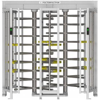 Полноростовой роторный турникет. Напряжение питания турникета: 12±2 B постоянного тока. Потребляемая мощность, не более: 84 Вт. Стыковка со СКУД: Любые типы СКУД. Пропускная способность в режиме однократного прохода в режиме турникета, не менее: 60 чел./мин.. Масса турникета, не более: 441 кг. Габаритные размеры турникета (ширина×длина× высота): 2270×1600×2250 мм. Ширина перекрываемого прохода: 2270 мм. Ширина прохода, не менее: 445 мм. Допустимые статические усилия на середине преграждающей штанги, не более: 200 кгс. Рабочий температурный диапазон: от +1°C до +50°C. Климатическое исполнение: УХЛ 4.2. Средняя наработка на отказ: 2 000 000 проходов. Гарантийный срок эксплуатации: 24 месяца. Срок эксплуатации, не менее: 8 лет