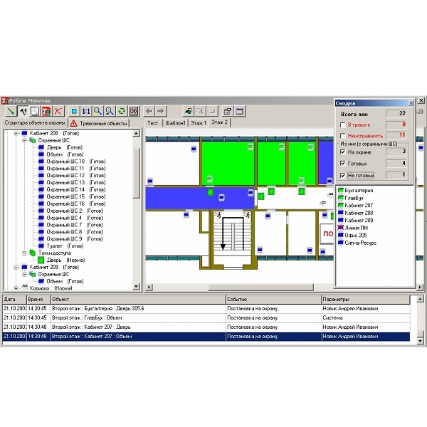 Структурное и графическое представление объекта охраны, управление прибором, протокол событий реального времени