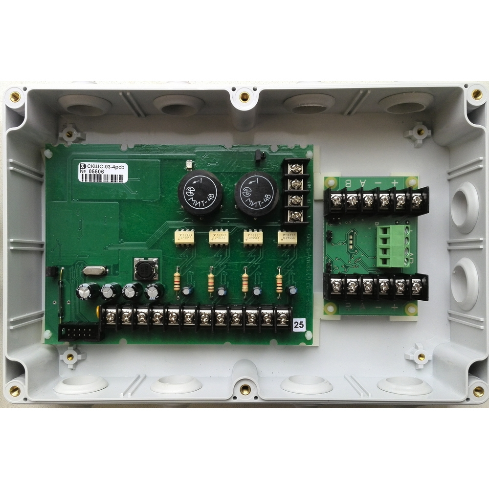 Сетевой контроллер шлейфов сигнализации, 4 оптоизолированных входа для технологической сигнализации, 2 ввода питания, 2 линии связи RS-485, корпус IP54.