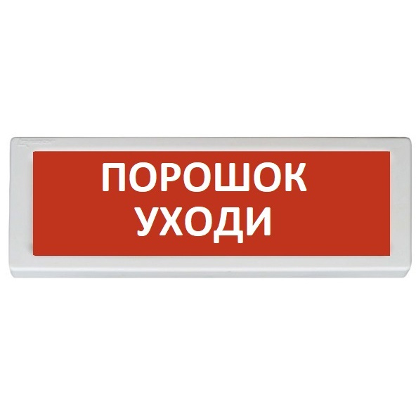 Оповещатель охранно-пожарный световой (информационное табло). Надпись: "порошок уходи", фон красный. Ток потребления светового оповещателя, мА, не более: 20. Напряжение питания (в зависимости от исполнения): 24 В DC. Степень защиты оболочки: IP41. Масса, кг, не более: 0.19. Ширина, мм, не более: 300. Высота, мм, не более: 100. Глубина, мм, не более: 20. Гарантийный срок эксплуатации, мес, не более: 36. Средний срок службы, лет: 10. Диапазон рабочих температур, °С: от -40 до +55
