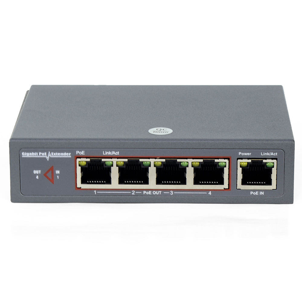 POE Экстендер. Интерфейсы: 1 PoE вход, RJ-45; 4 PoE выхода, RJ-45. Скорость передачи данных: 10/100/1000 Mbps. Вход PoE: Метод А 1,2(+)/3,6(-), Метод В: 4,5(+),7,8(-). Выход PoE: Метод А 1/2 (+), 3/6(-). Выходная мощность до 25 Вт на порт. Разъемы: Экранированный RJ-45, EIA 568A и 568B. Кабель: Экранированный компьютерный кабель «Витая пара» категории 5е и выше. Габариты: 119мм х 85мм х 28 мм. Вес: 540гр. Монтаж: Настенный, настольный. Рабочая температура окружающей среды: от -10 до 45 C. Температура хранения: от -40 до 70 °C. Класс пыле- влаго- защиты: Отсутствует, только для использования внутри помещений. Соответствие стандартам PoE: IEEE 802.3af (15,4 Вт), IEEE 802.3at (30 Вт), IEEE802.3at 4 пары (60 Вт)