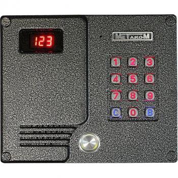 Многоабонентный антивандальный цифровой блок вызова, цифровая система адресации, ёмкость до 255 абонентов, трёхразрядный цифровой дисплей, контроллер Touch Memory (ключи типа ТМ2002, ТМ2003, ТМ2004, DS 1990A), индивидуальные коды, свето- и аудиоиндикация режимов работы. Габариты: 180X150x30. Работа с трубками типа: ТКП-12D. Рассчитан на работу с электромагнитным замком.