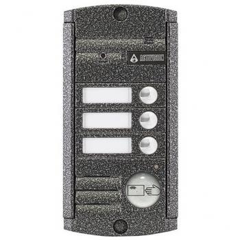 4-х проводная антивандальная накладная видеопанель, 3-х абонентная, со встроенным Proxy считывателем. Корпус цвета антик с ИК подсветкой до 0,6м, матрица 1/3", разрешение 1000 ТВл, 12В, угол обзора 75 (гор.) 55 (верт.); рабочий диапазон t -50…+50; 140х70х20 мм.