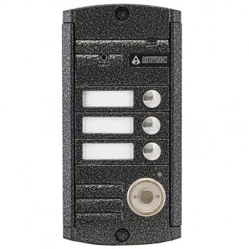 Антивандальная накладная 4-х проводная видеопанель, 3-х абонентная. Оснащена встроенным Touch Memory считывателем. Цвет: антик; с ИК подсветкой до 0,6м, матрица CCD SONY, 1/3", разрешение 1000 ТВл, питание 12В, угол обзора 75 (гор.) 55 (верт.); рабочий диапазон t - 50… + 50; размеры 140х70х20 мм.